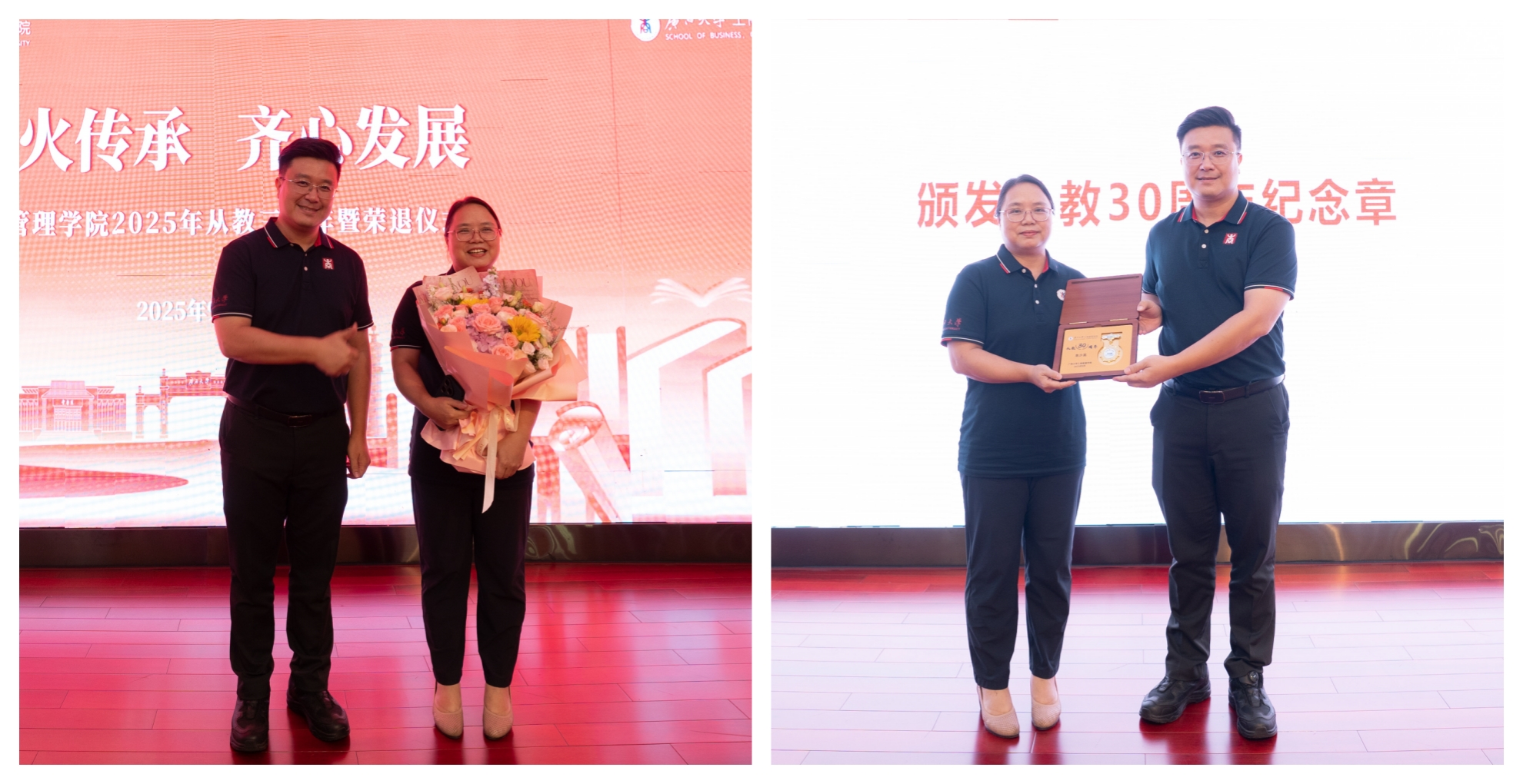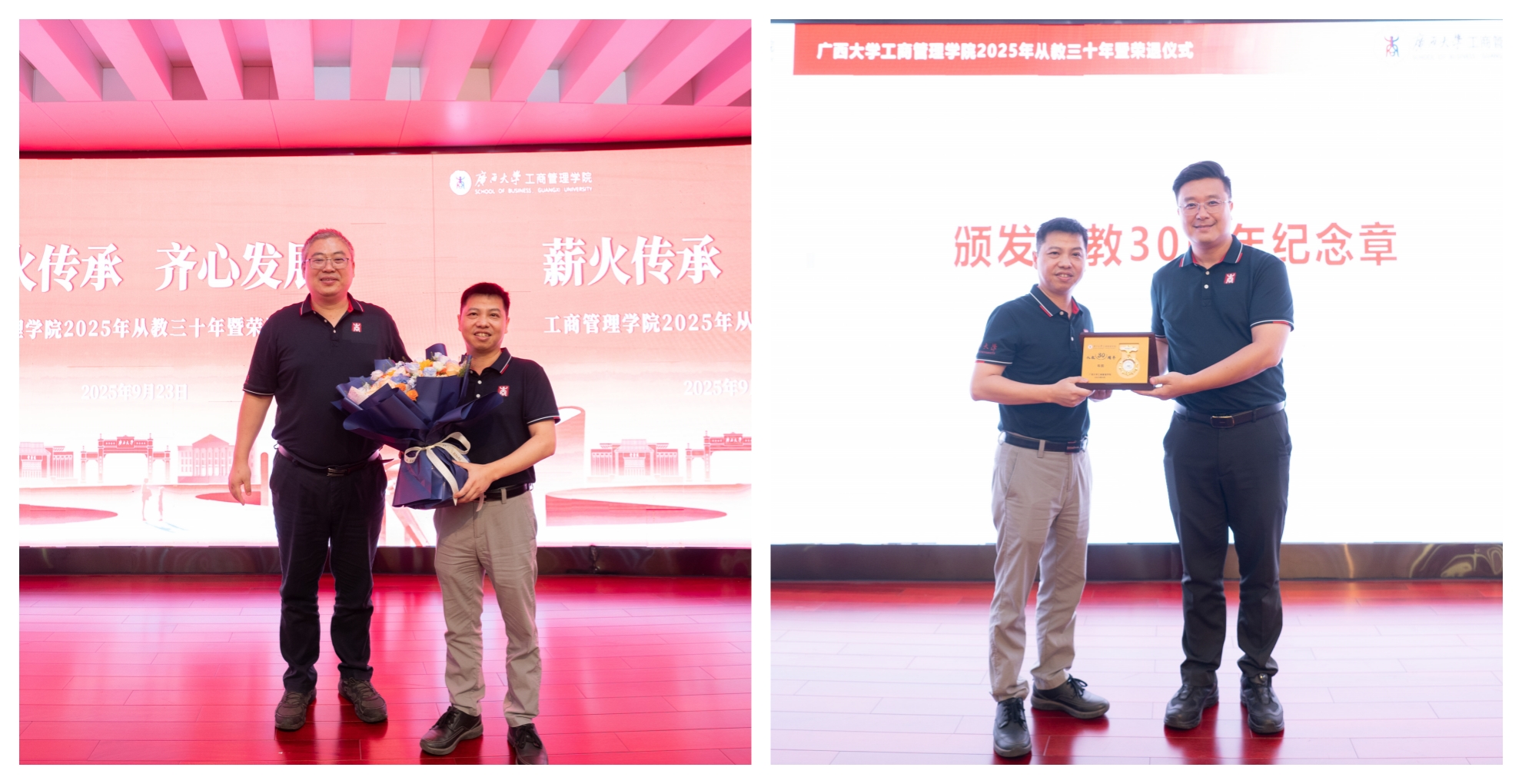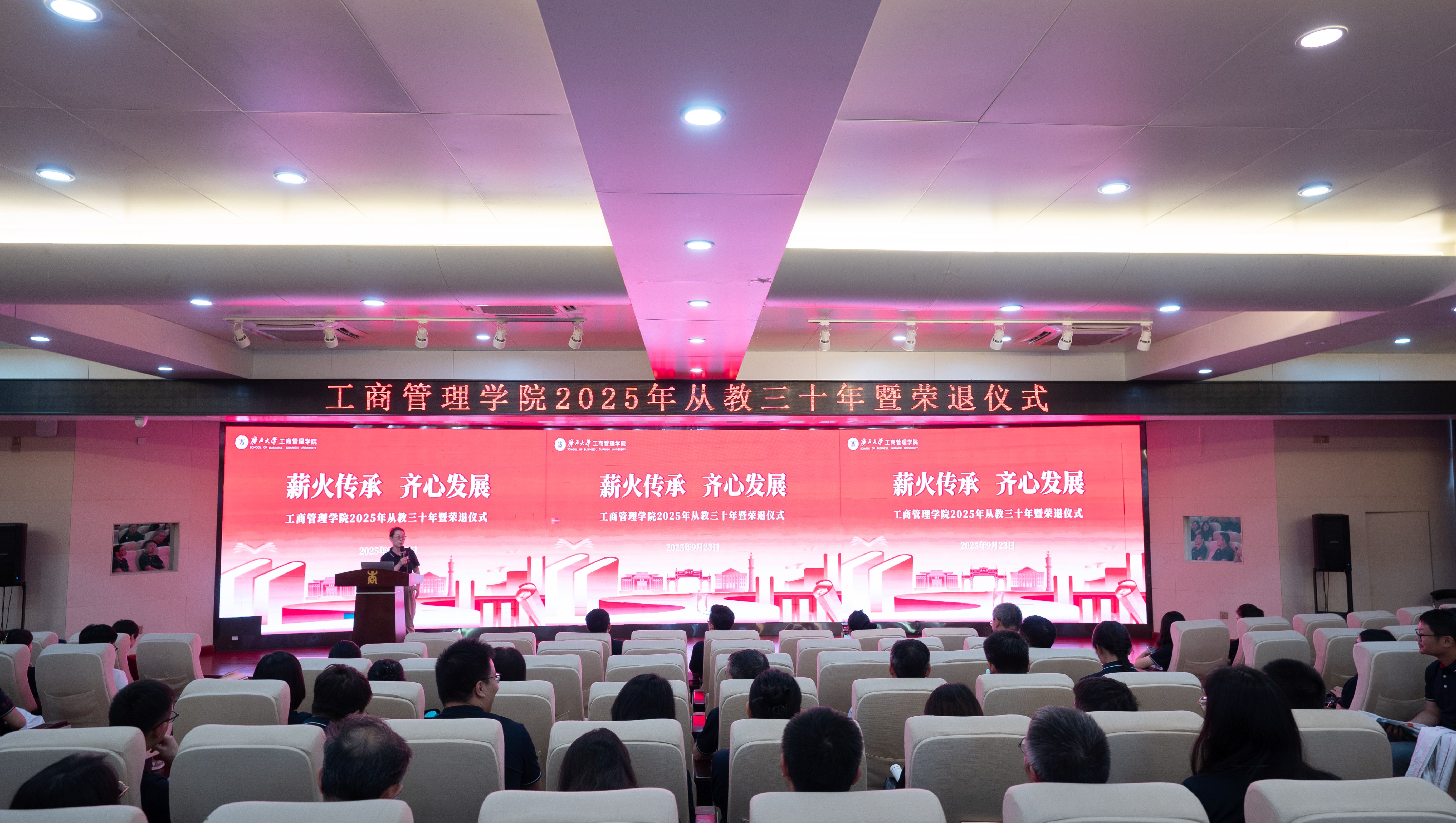 为大力弘扬教育家精神,进一步营造尊师重教良好氛围,9月23日下午,学院128报告厅内乐声悠扬、暖意融融,学院党委书记黄晋、院长朱帮助,党委副书记肖克宁,副院长朱少英、申韬、廖东红、韦铁,学校科研平台建设管理处副处长刘民坤与全院教职工欢聚一堂,举行2025年从教三十年暨荣退仪式,向五位教育工作者致以崇高敬意。