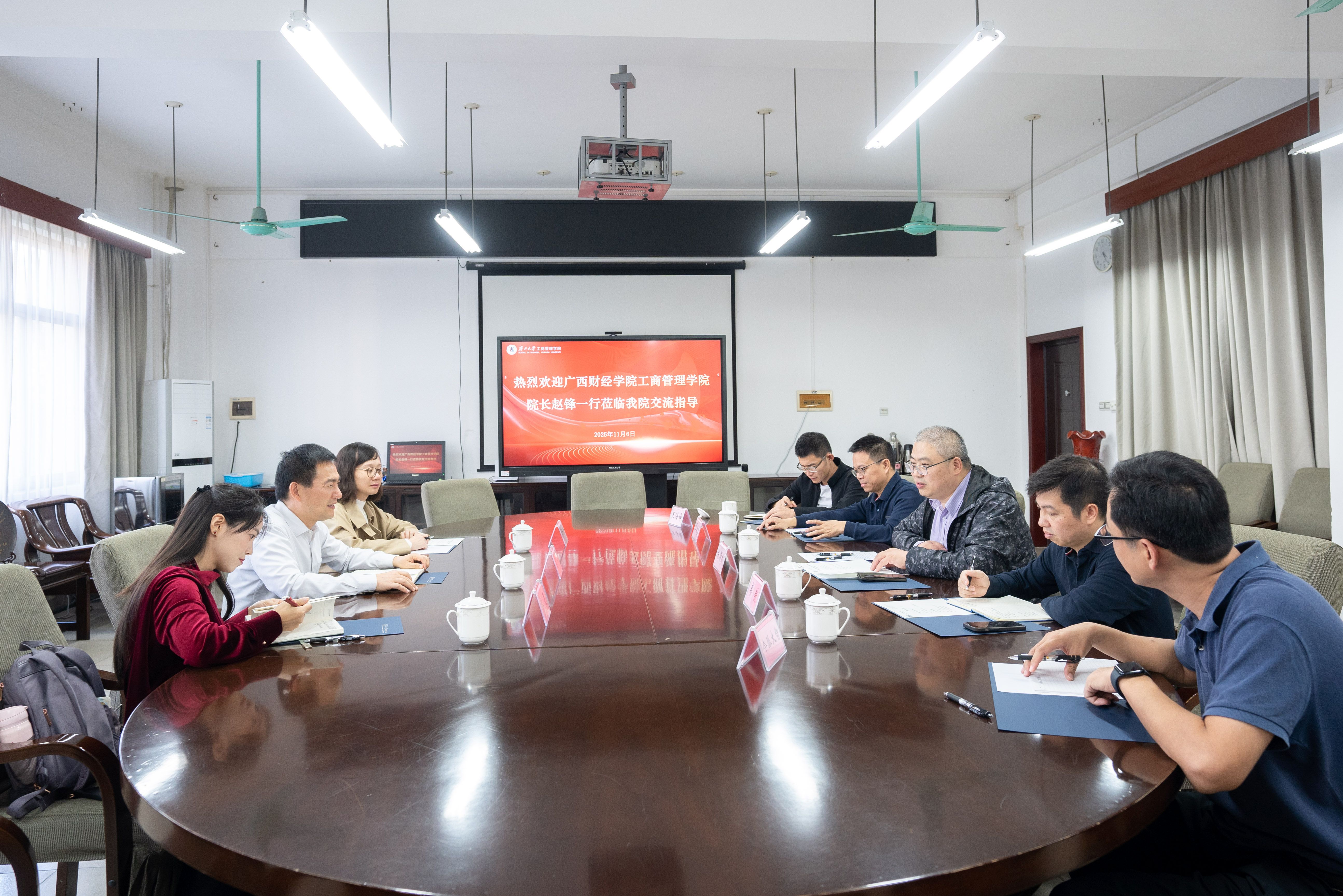 朱帮助对赵锋一行的到访表示欢迎,并简要介绍了我们的办学特色、学科建设、师资力量与人才培养等情况。他表示,两院在学科领域有诸多共通之处,具备良好的合作基础,希望双方加强交流,分享在教学、科研、社会服务等方面的经验,在人才培养和学科建设上取得新的突破,为广西经济社会发展培养更多优秀的商科人才,实现互利共赢的良好局面。