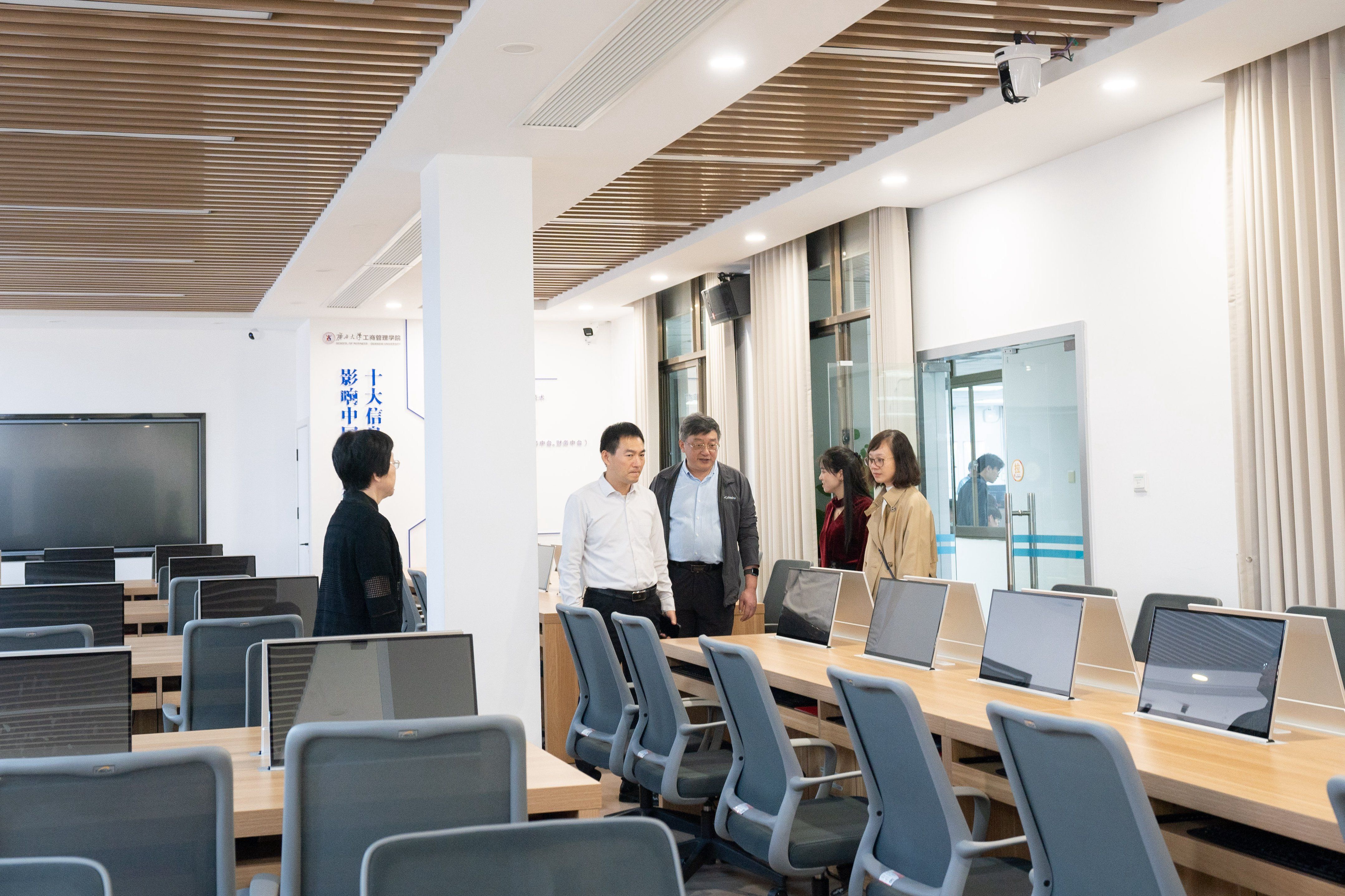 会前,赵锋一行在副院长廖东红的陪同下参观了我们研究生管理中心、智能会计与智慧财务实验室、教师工作间、研讨室、研究生自习卡座等办学环境和教学设施。